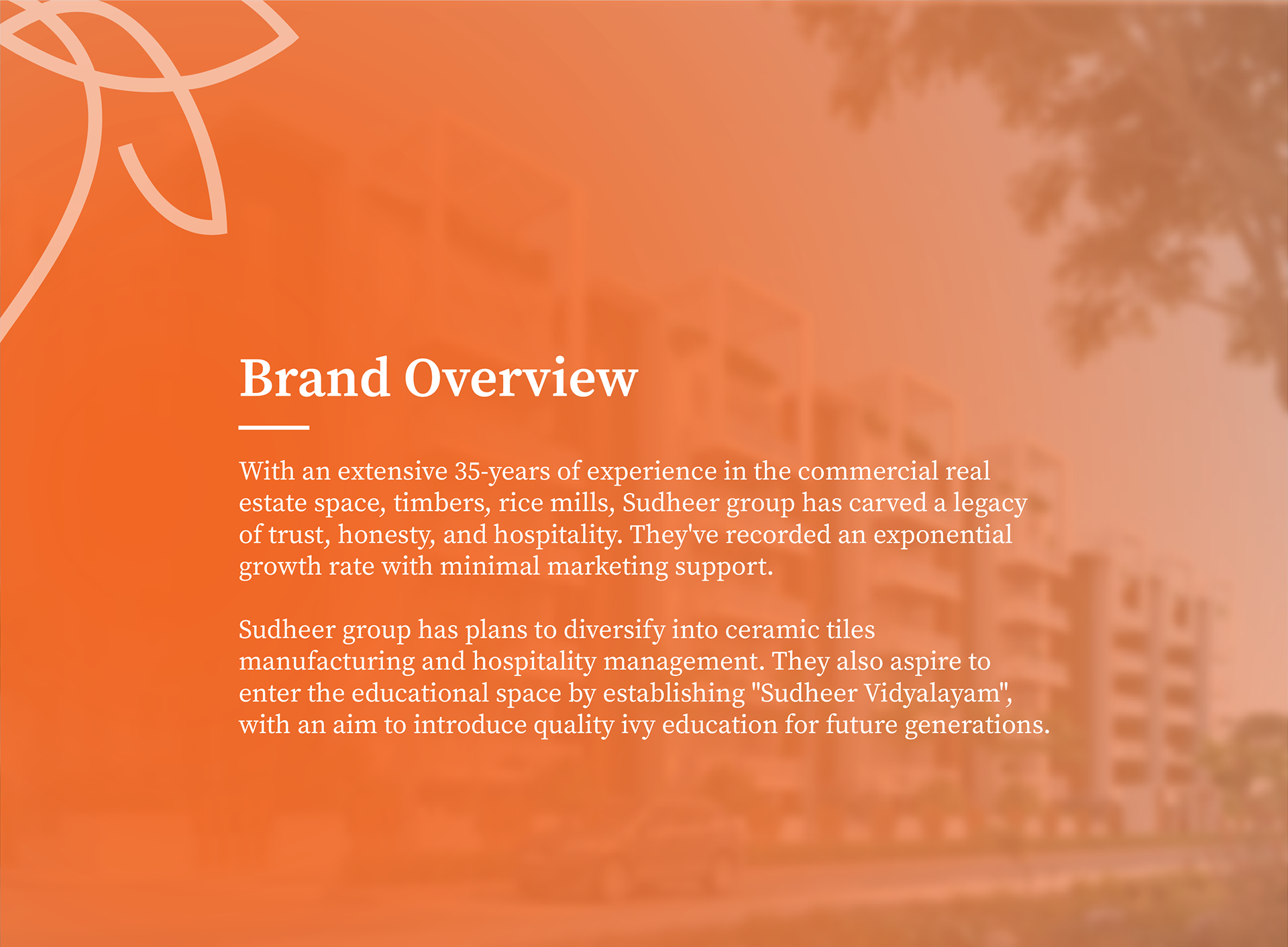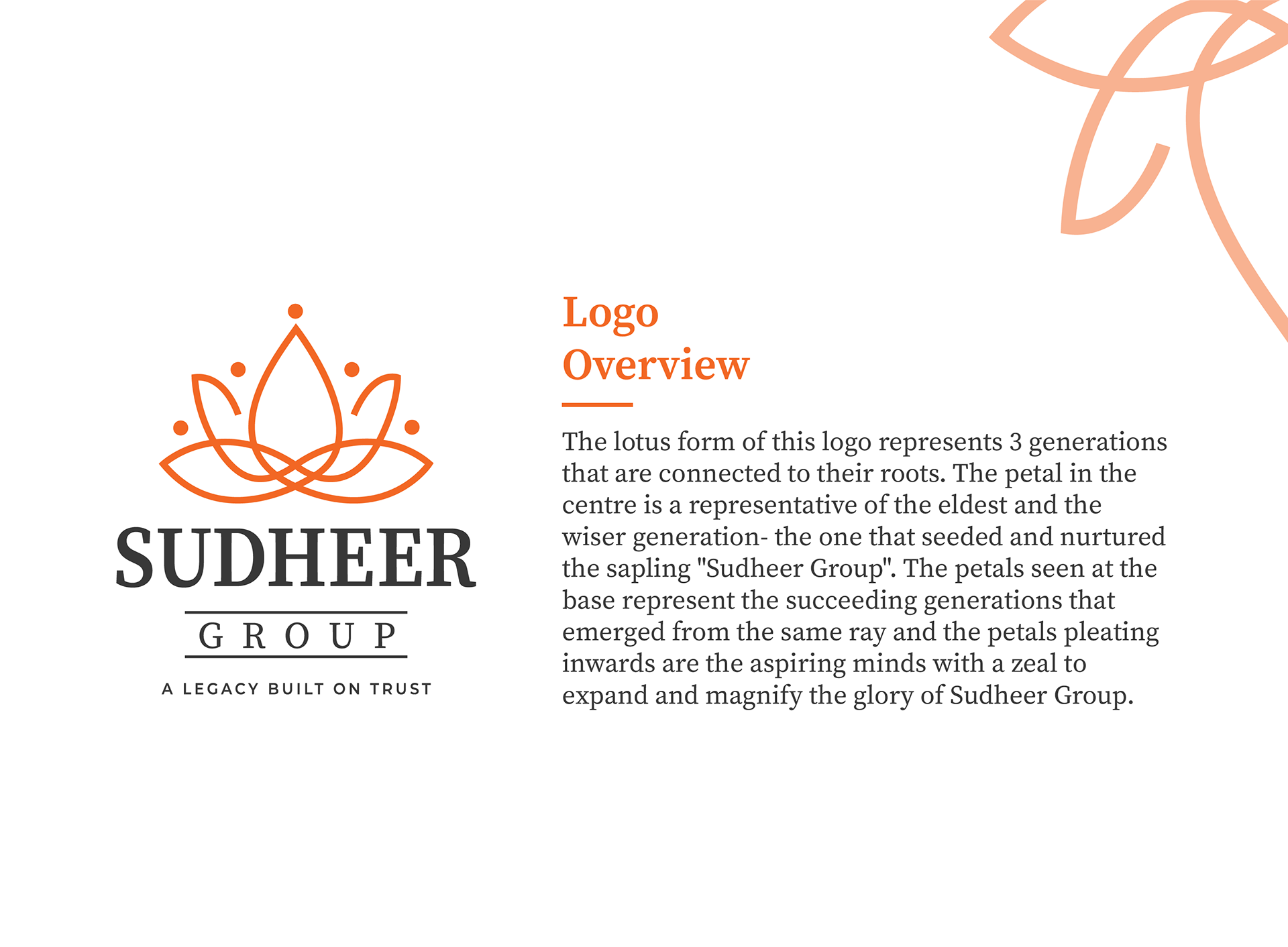 Brand Identity Design of Sudheer Group, a diverse brand with 35 years of experience and a legacy of trust, honesty and hospitality.